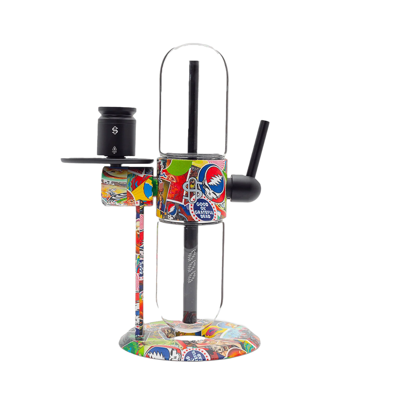Stündenglass presents the Grateful Dead x Stündenglass Gravity Infuser - Legacy Patchwork, the newest device collaboration with world-renowned American rock band and timeless cultural icon, Grateful Dead. A true functional work of art, each Legacy Patchwork infuser is coated with over 30 different pieces of iconic Dead imagery from throughout the band’s storied history by a hand-dipped water transfer method that leaves no two units exactly alike. Thoughtful details include the classic Grateful Dead logo, lightning bolt, and Stealie engraved on the upstems and hookah bowl tray.